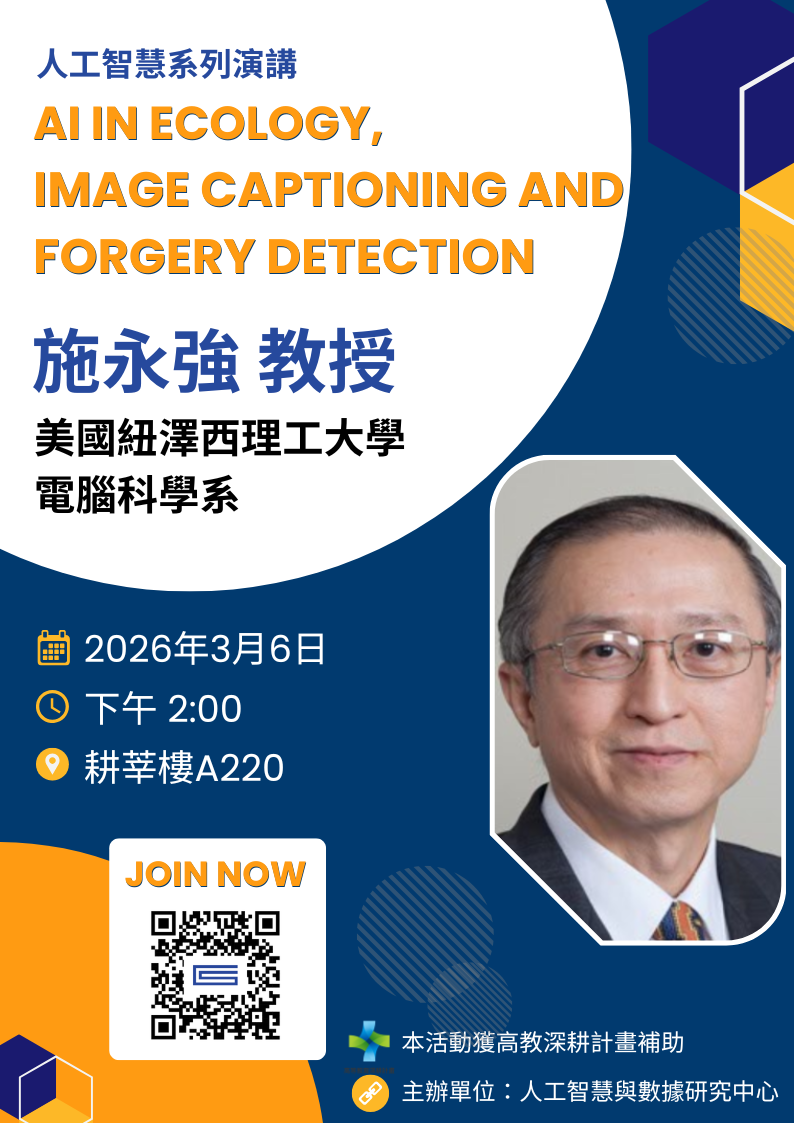 施永強 教授 蒞校演講,分享 AI 在生態應用、影像理解與偽造偵測領域的最新研究成果與實務經驗。