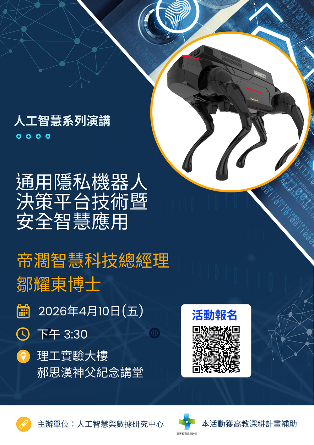 為促進人工智慧與隱私保護技術之交流,本校人工智慧與數據研究中心特別邀請帝濶智慧科技總經理鄒耀東博士分享通用隱私機器人決策平台的核心技術,並探討在智慧安全領域中的應用與未來趨勢,內容兼具理論與實務,適合對AI、資安及資料治理有興趣的師生參加。